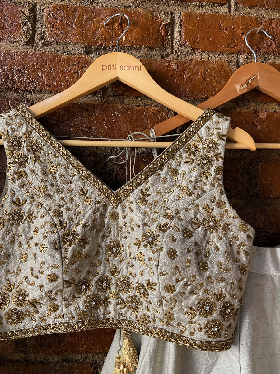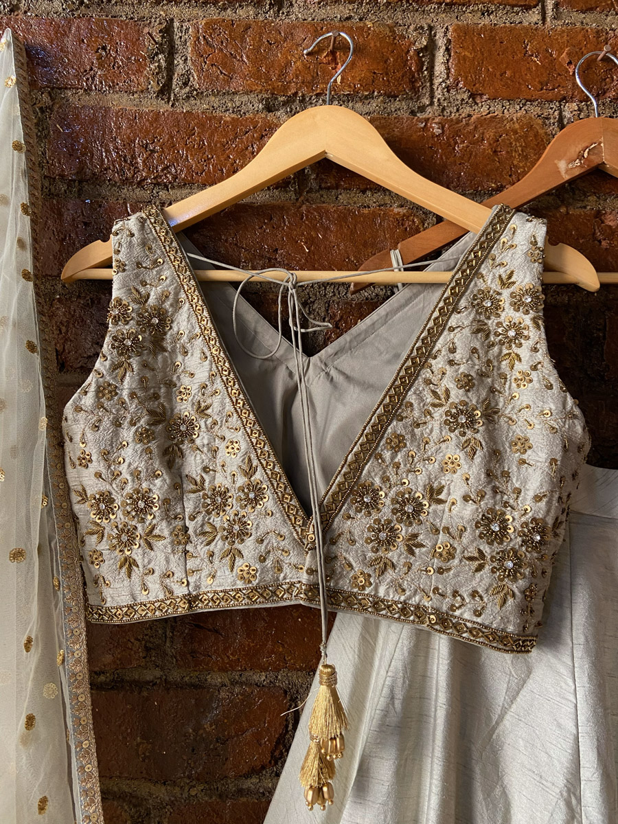 Grey Raw silk lehenga set with Sequin, Zardozi and Beads hand embroidery paired with sequin net dupatta.