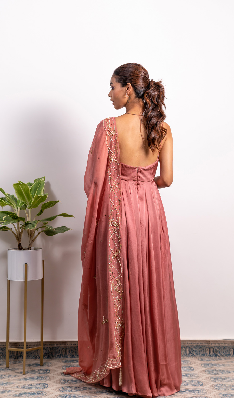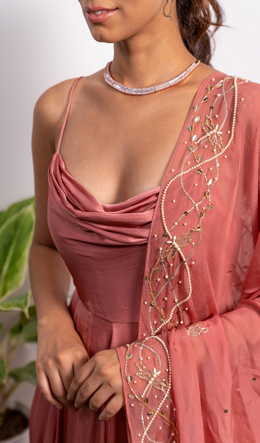 High Slit Cowl Neck Anarkali With Embroidered Dupatta (Without Slit Available)