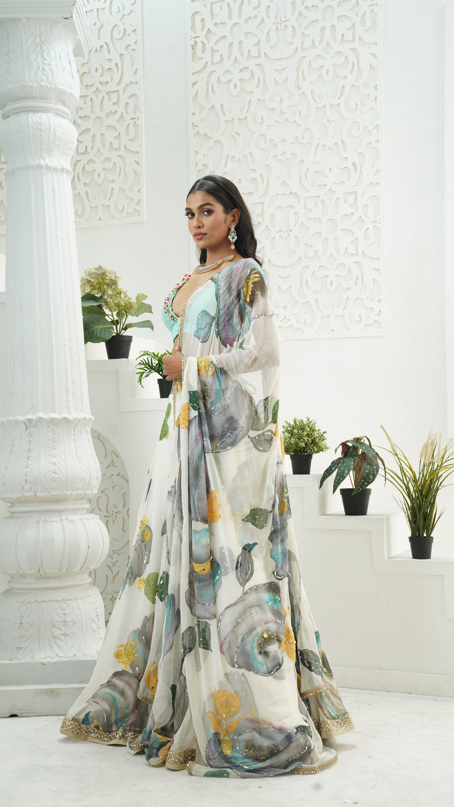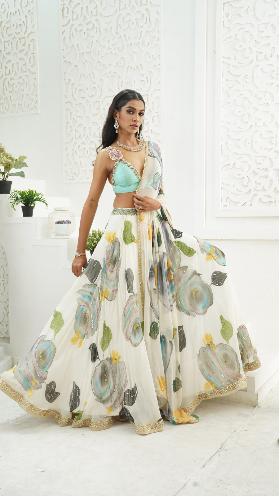 Ivory georgette hand painted and hand embroidered lehenga with Mint Green floral embroidered bralette and Ivory hand embroidered dupatta set.