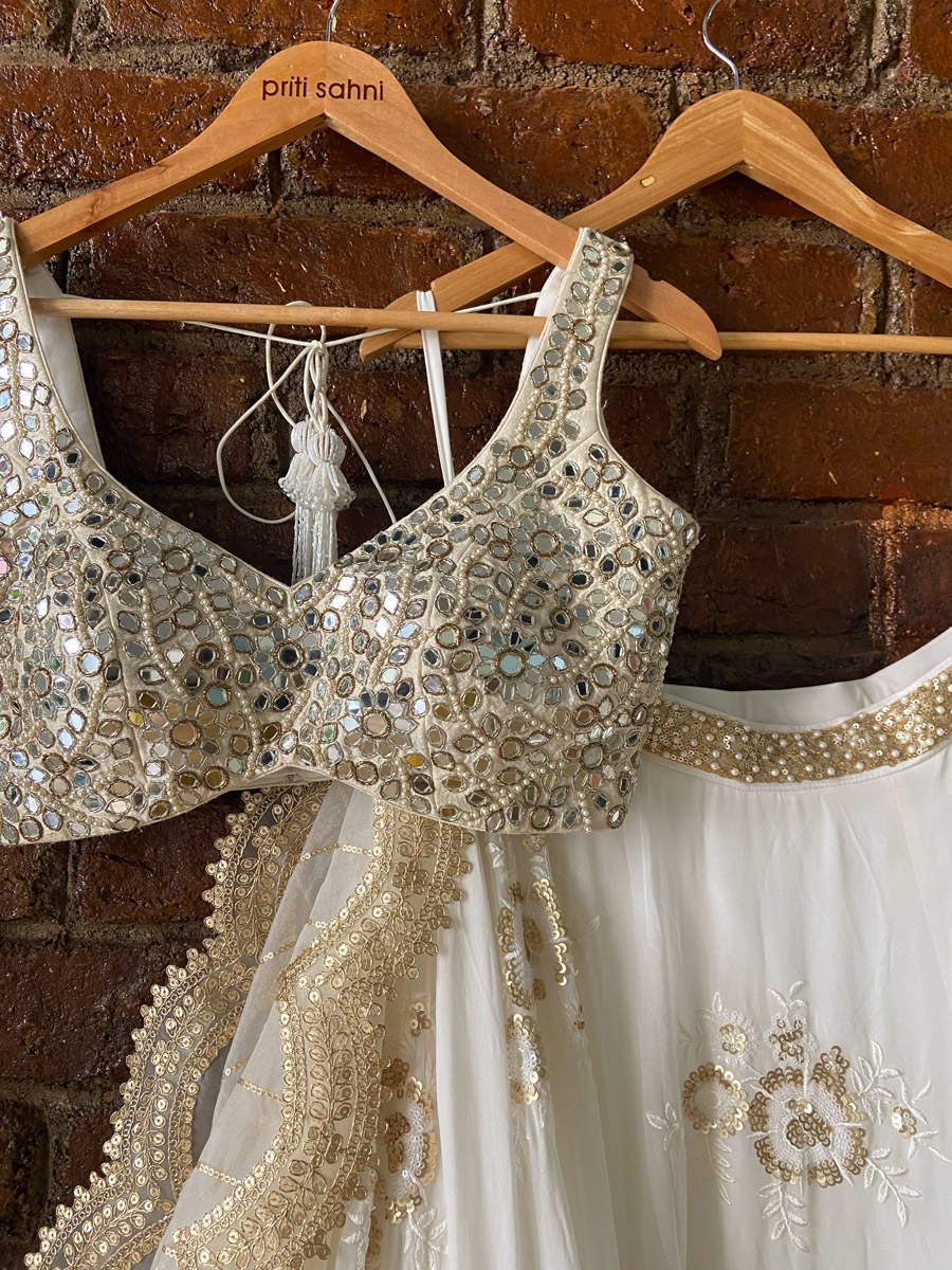 Ivory georgette lehenga with big sequin and thread work butti with Scalloped zari work detailing, paired with Ivory raw silk blouse in mirror and pearl work. The look is complete with Ivory organza sequin work dupatta.