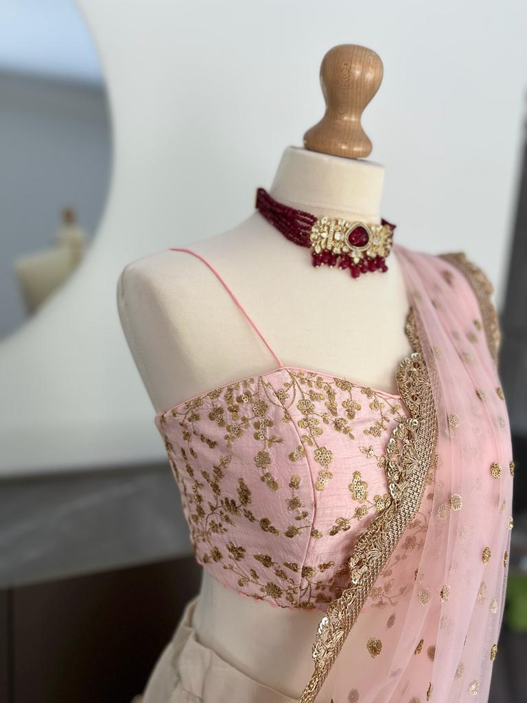 Ivory Silk Skirt with Pink Threadwork Bustier Blouse