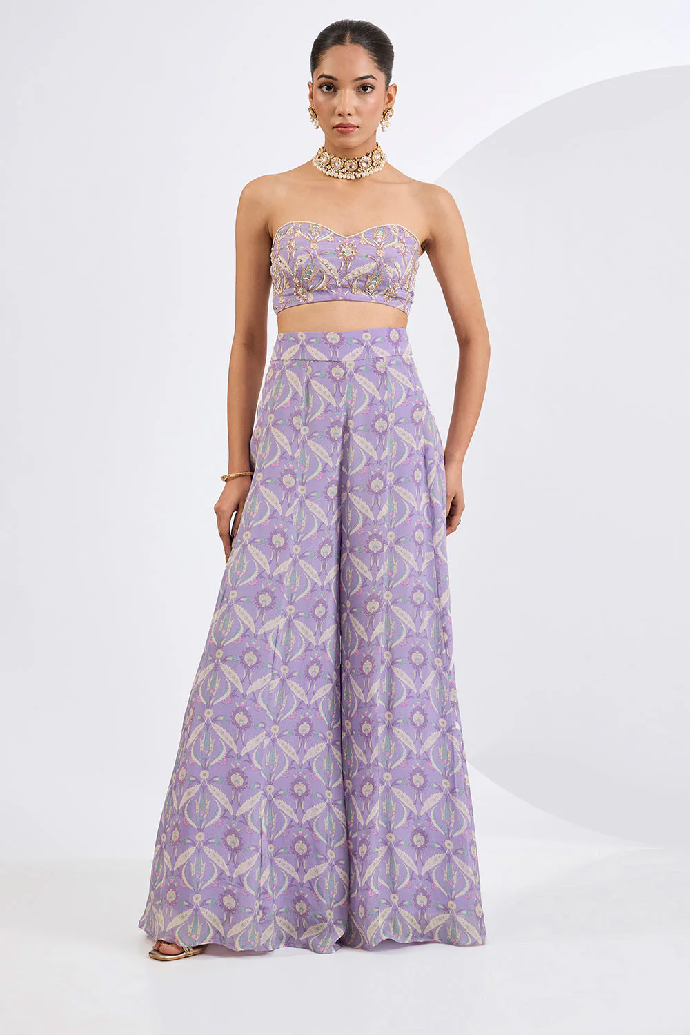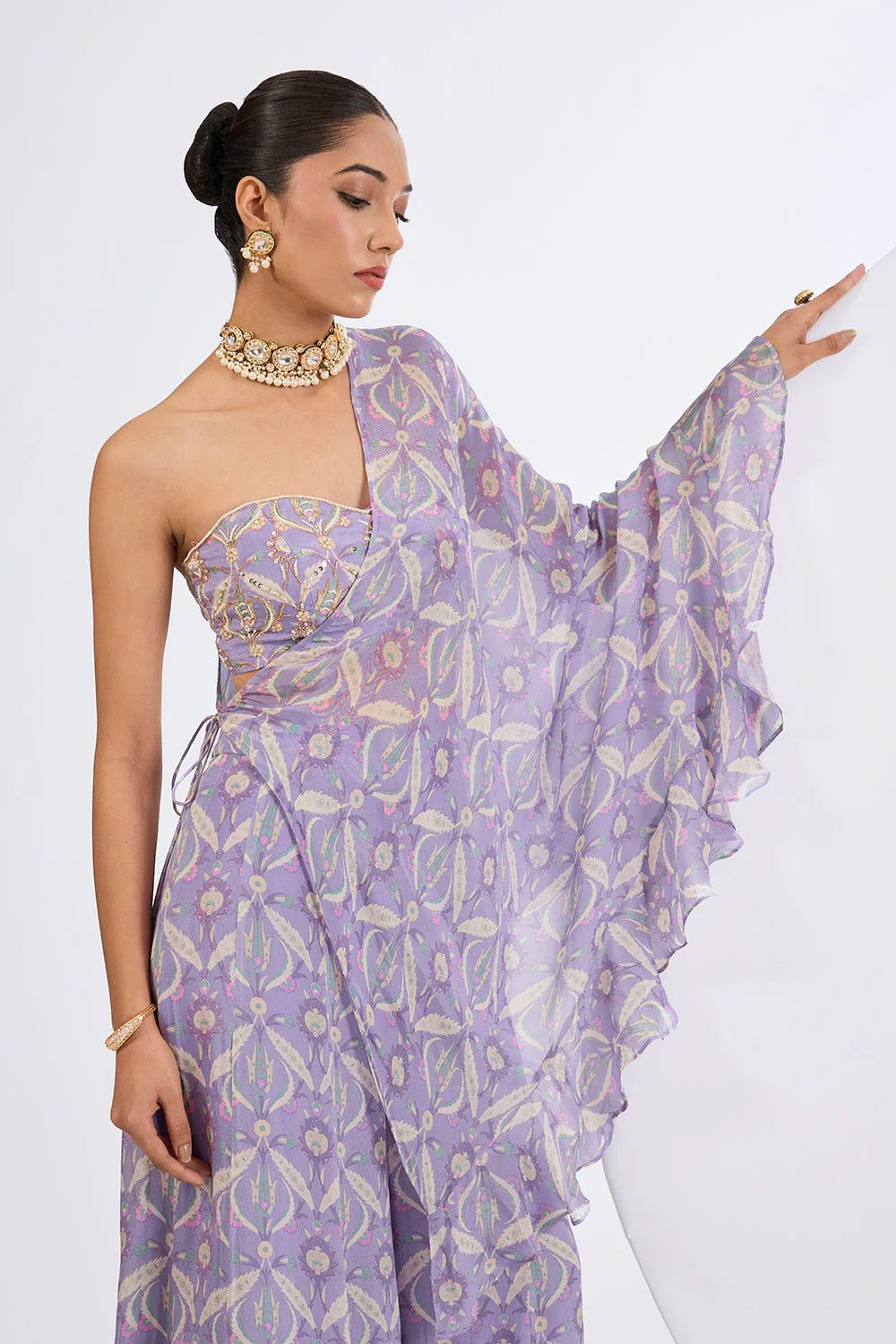 A beautiful lilac sharara set with intricate weaving that adds a touch of elegance and tradition. It is paired with a cape dupatta with delicate detailing of tassels making it a perfect choice for light festive occasions