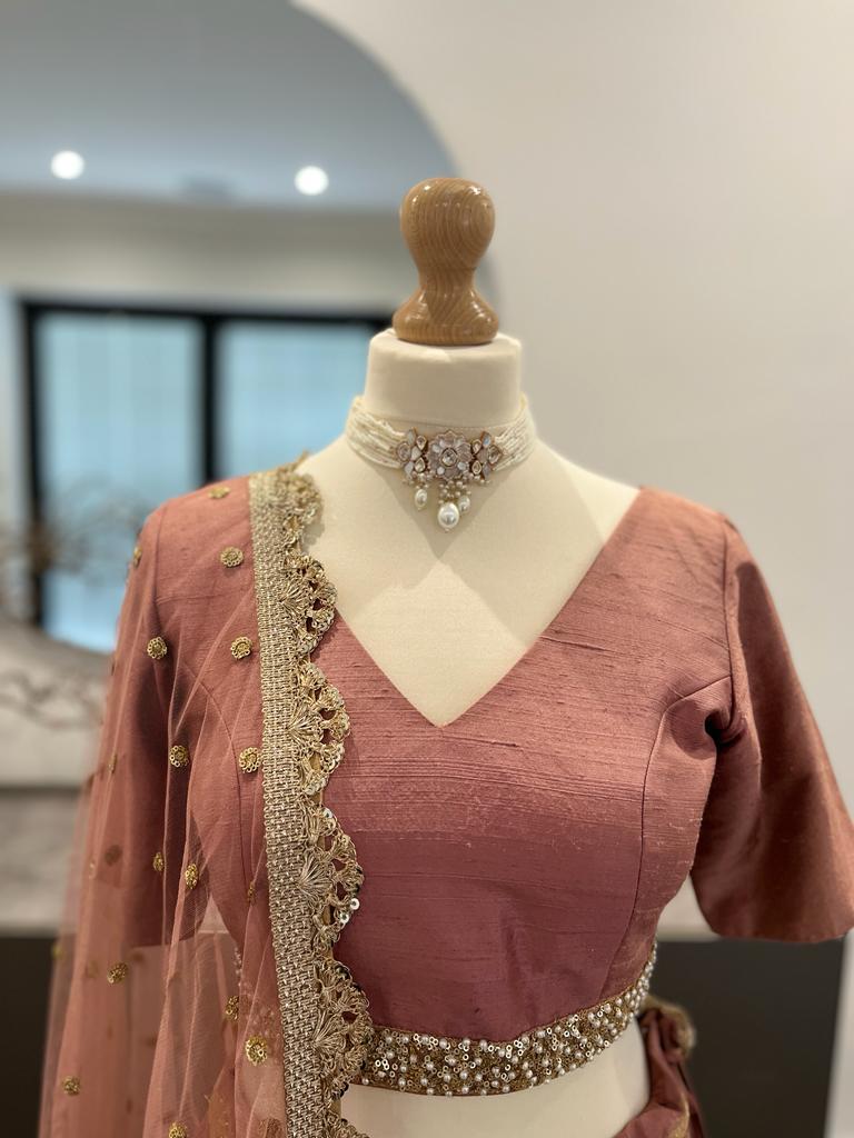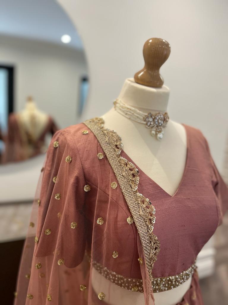 Our bespoke mulberry pink georgette butti motif lehenga teamed with a matching raw silk blouse with sequin/pearl zari work.