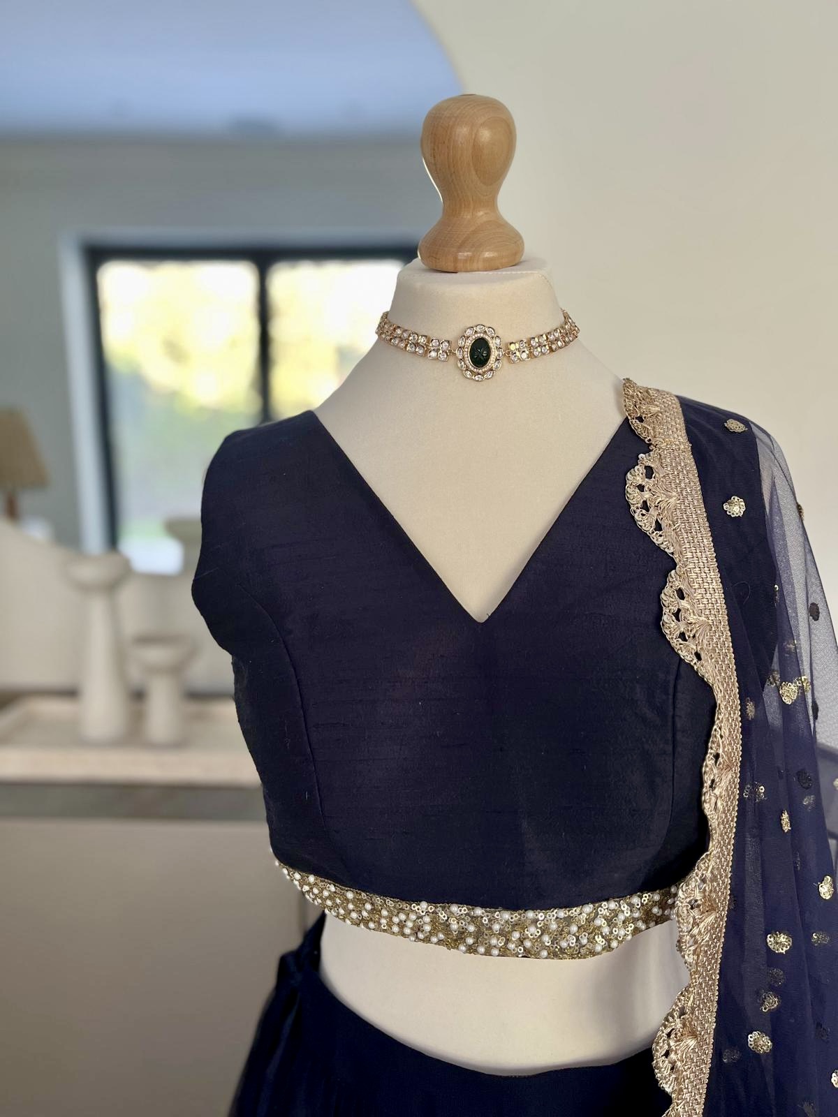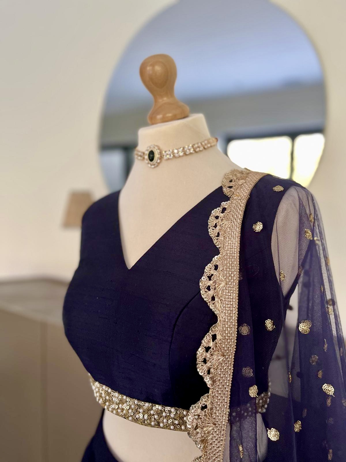 Our bespoke navy blue tiered tulle with ruffle detailing lehenga teamed with a navy raw silk blouse with a modest neckline depth. A net dupatta with scalloped gold border completes the look.