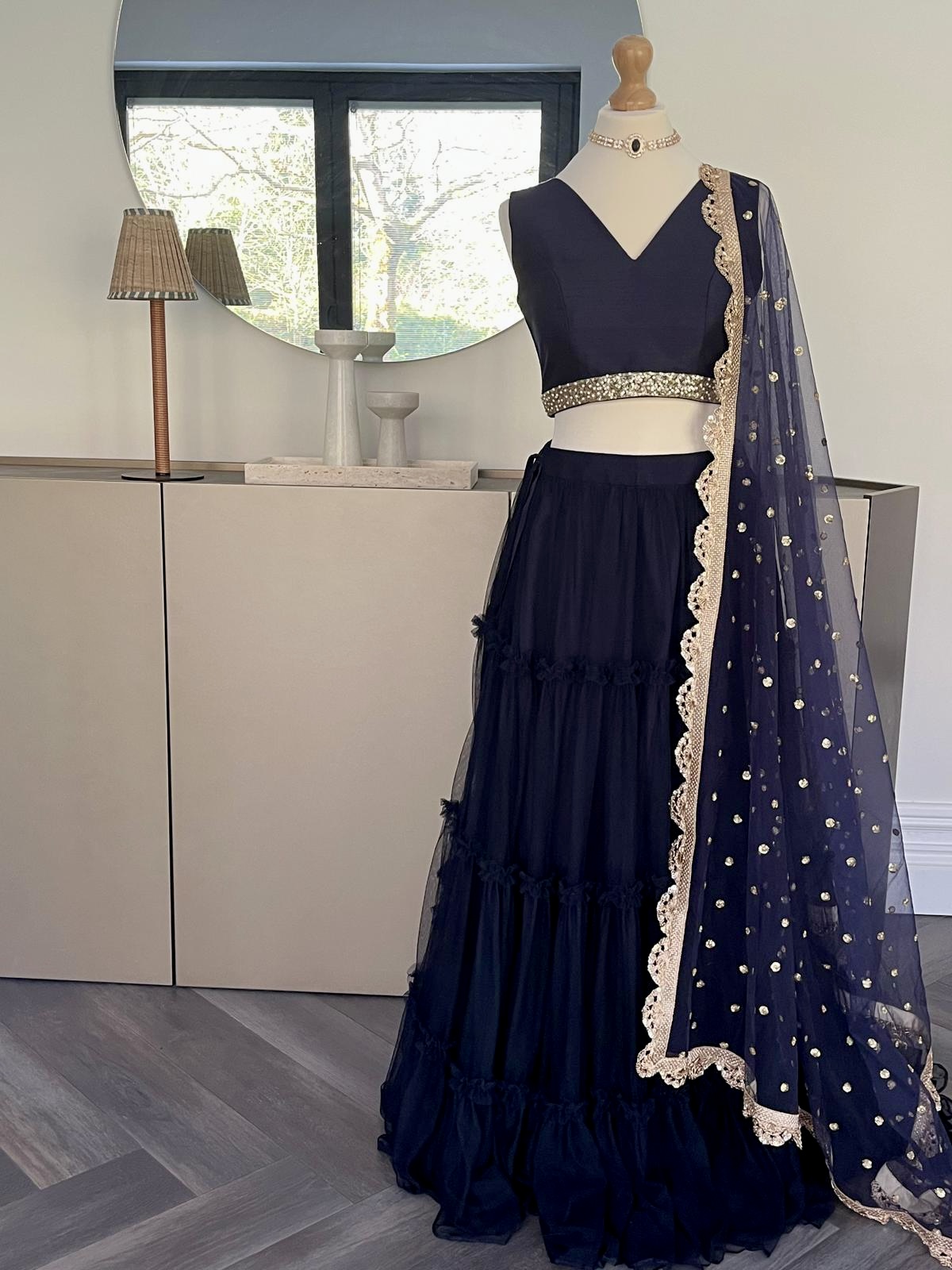 Navy Blue Tiered Tulle With Ruffle Detailing Lehenga