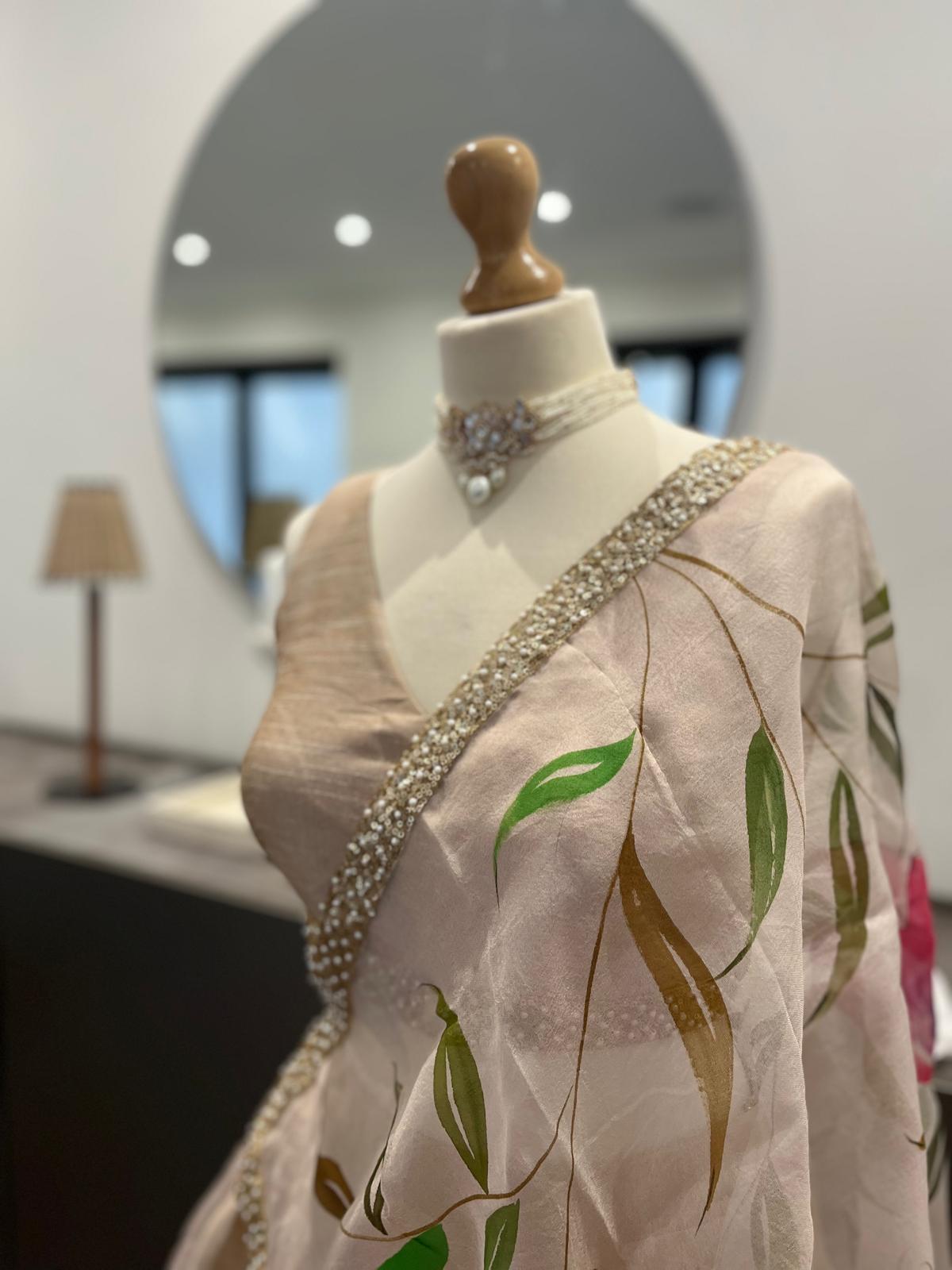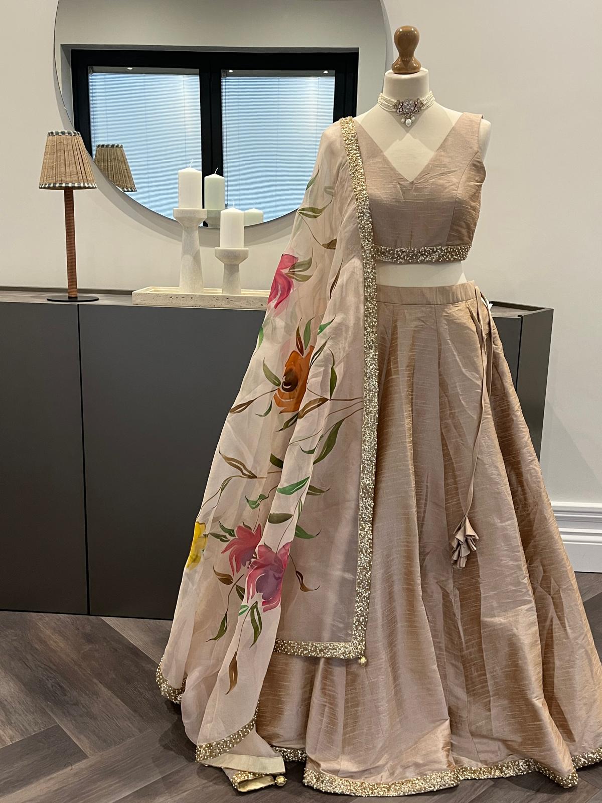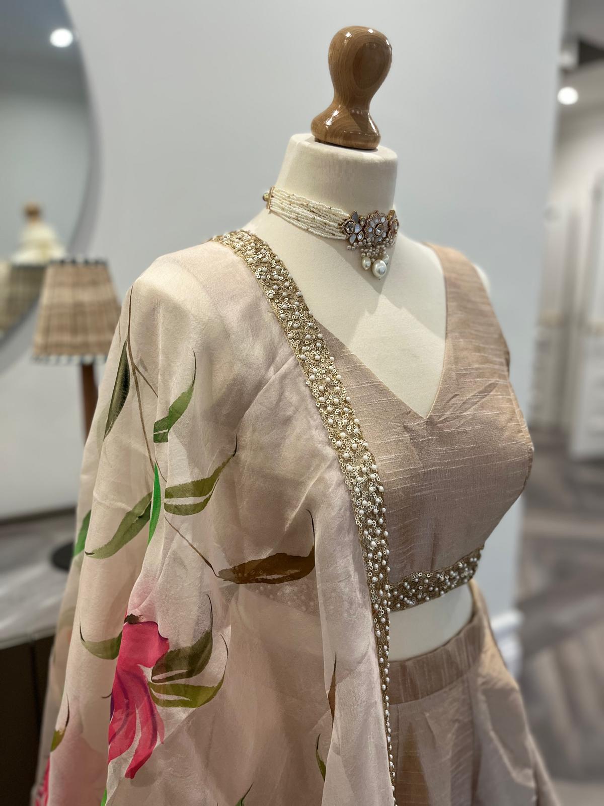 Nude raw silk lightweight lehenga with a pearl/sequins border. Teamed with a complimenting V neck blouse with tie up closure for easy adjustability at the back.