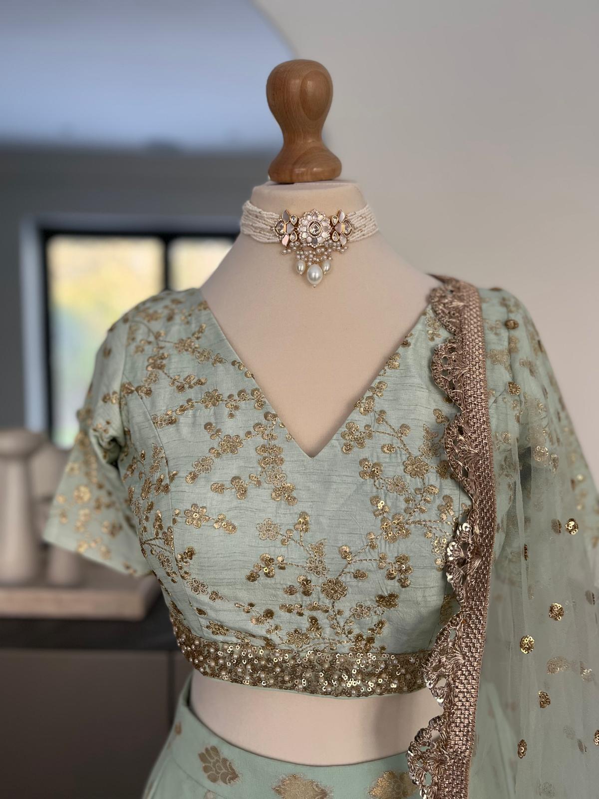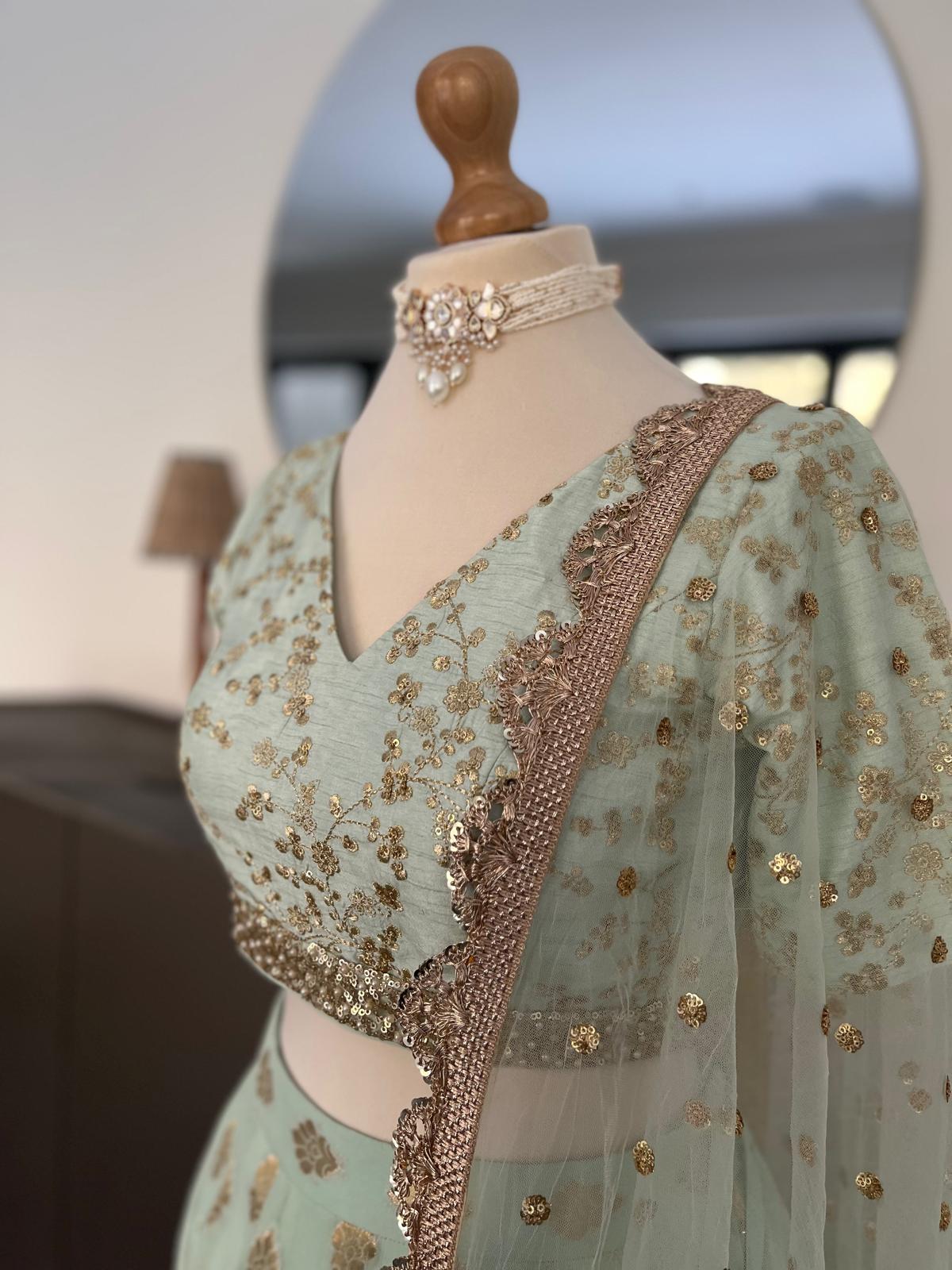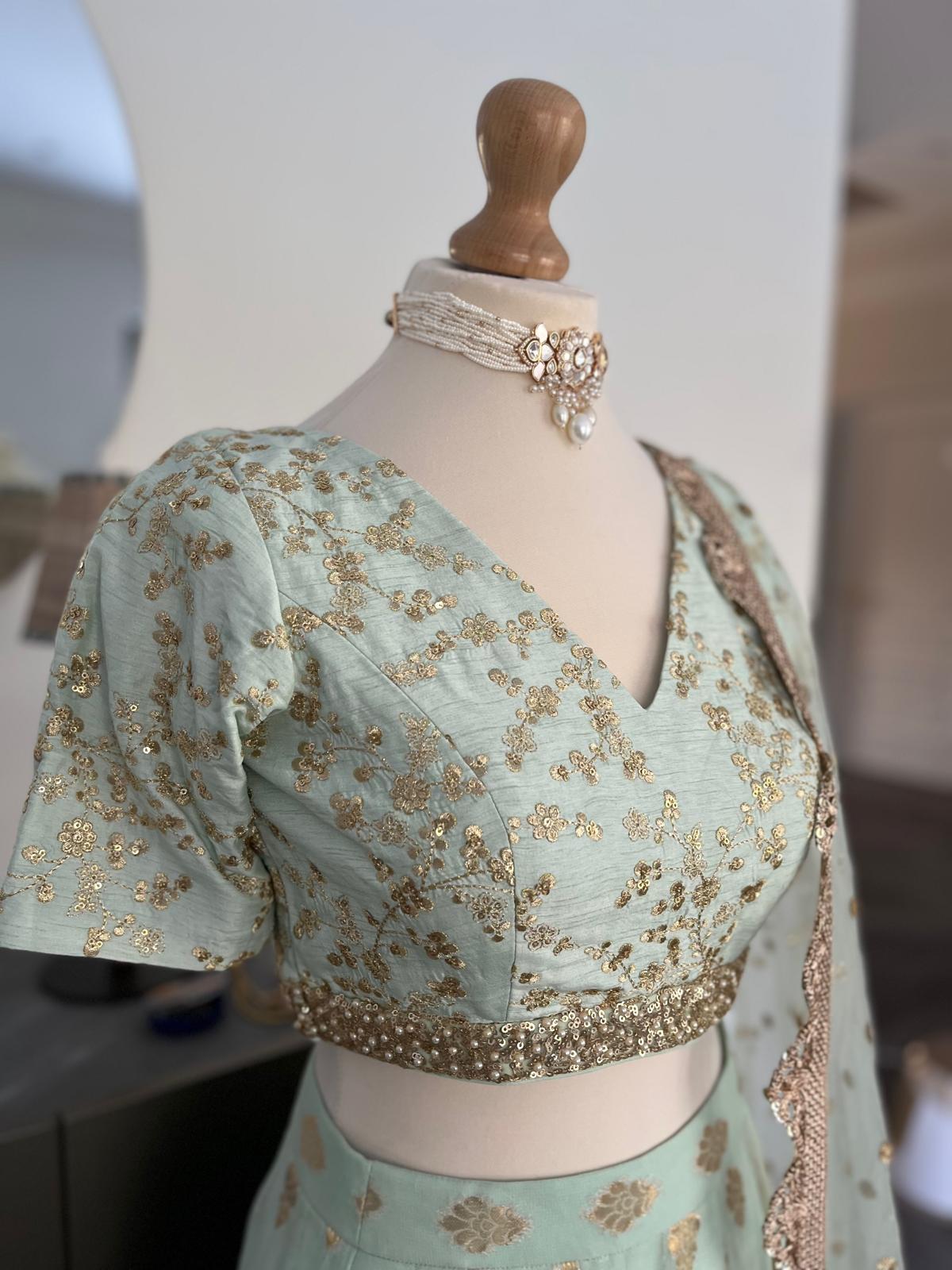 Pale mint georgette butti motif lehenga teamed with a matching raw silk blouse embellished with sequinned zari work.