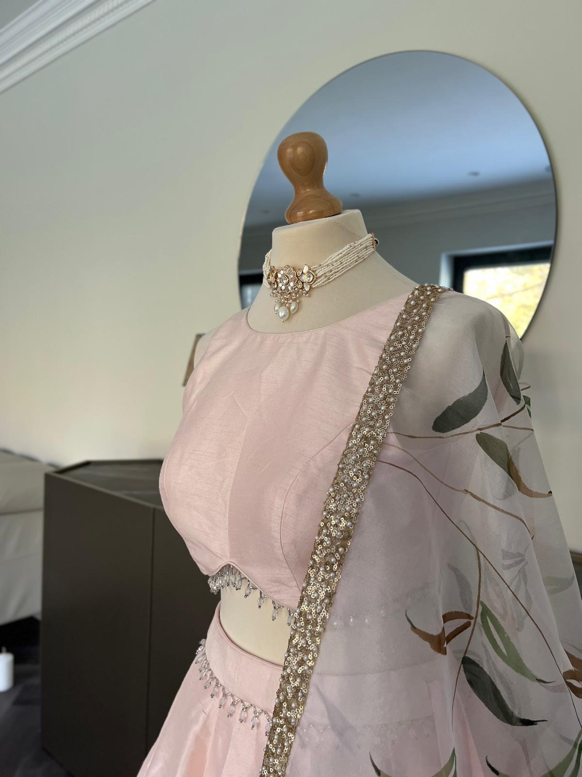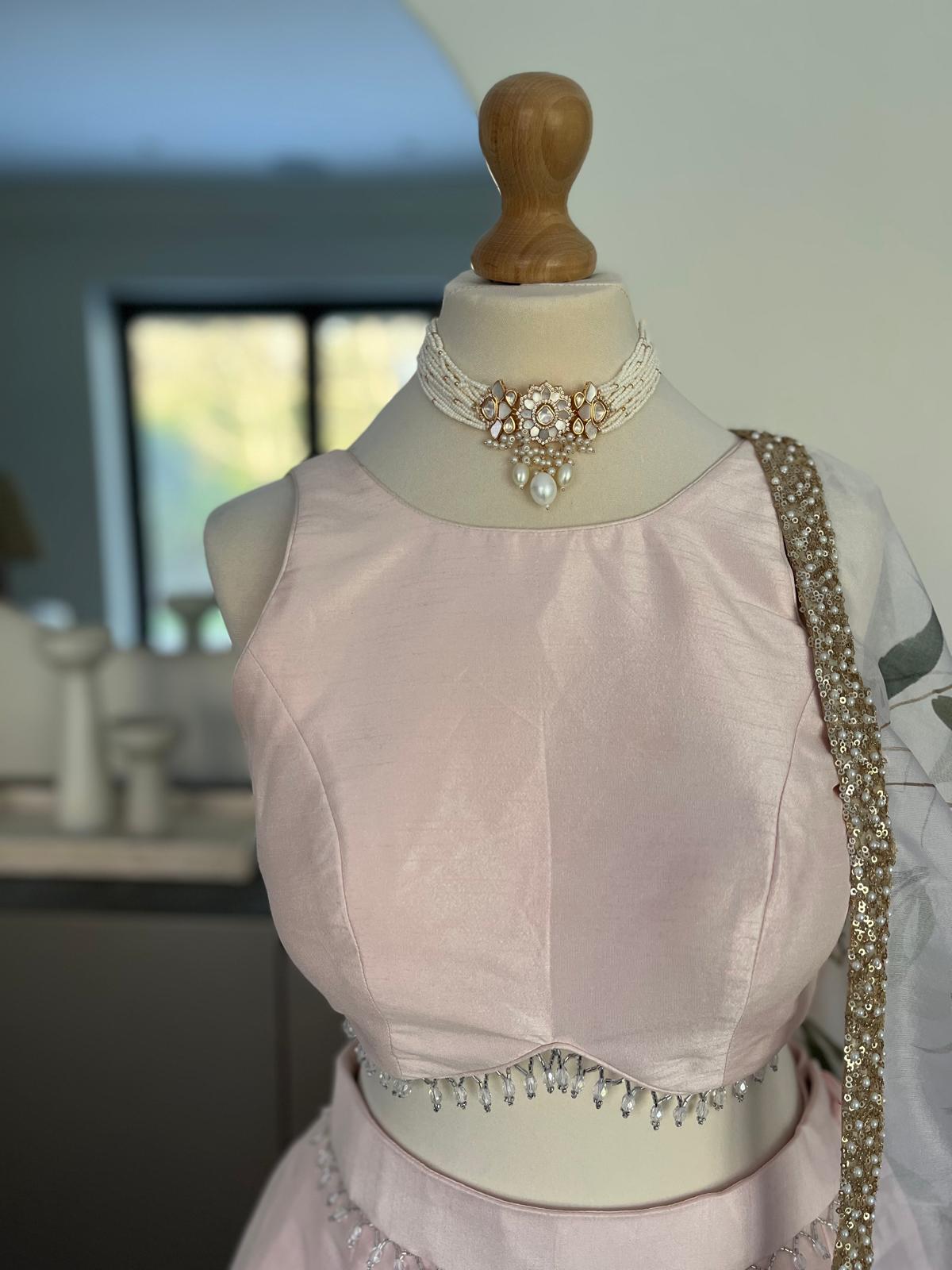Our bespoke pale pink raw silk lehenga with a sequin pearl border edging.