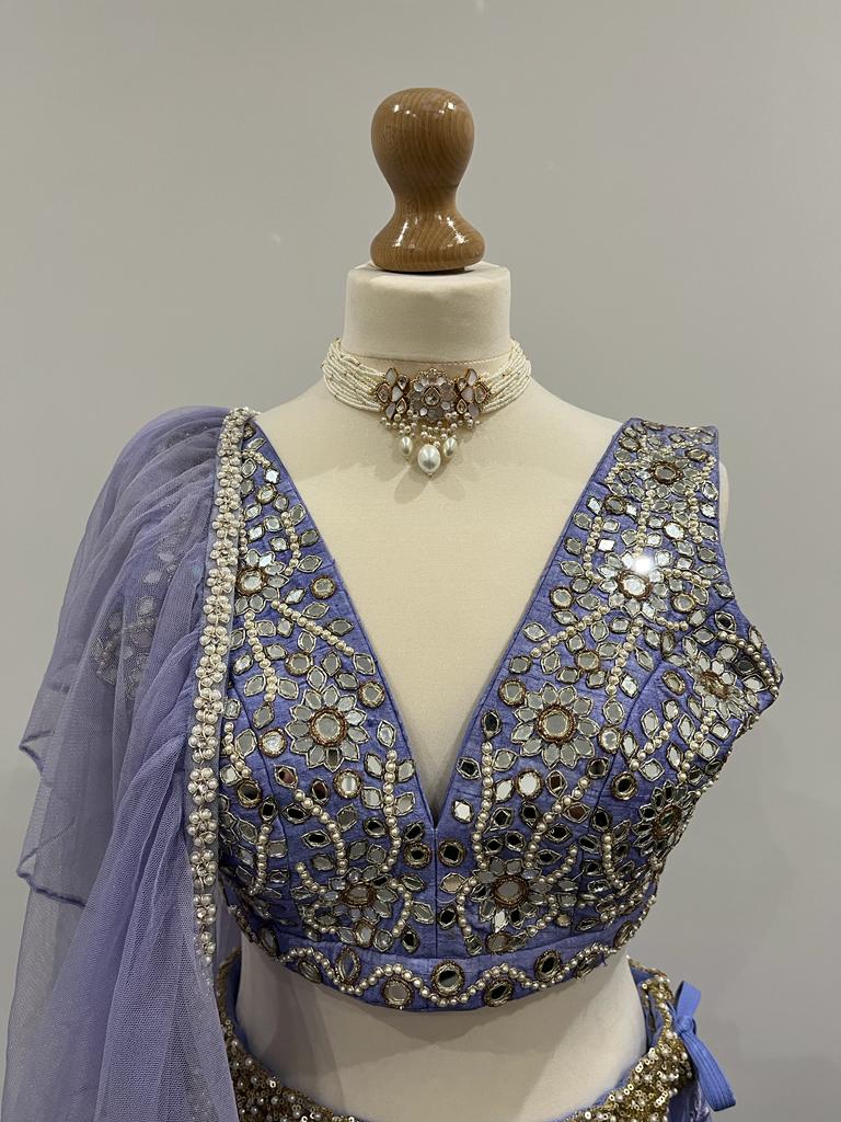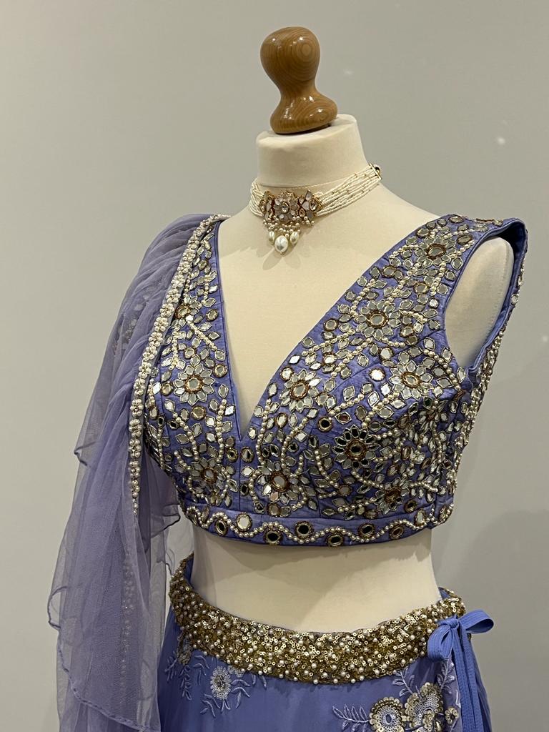 Paired with Same color raw silk blouse with mirror and pearl handwork in plunging neckline.
