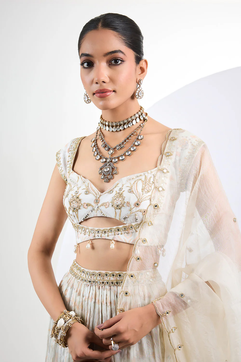 An elegant ivory lehenga set crafted from lightweight chinon chiffon, featuring delicate prints that add a subtle yet sophisticated charm. The ensemble is enhanced with intricate pearl tassels for a touch of finesse and paired with a hand embroidered sheer organza dupatta, creating a perfect blend of tradition and effortless grace for any special occasion.