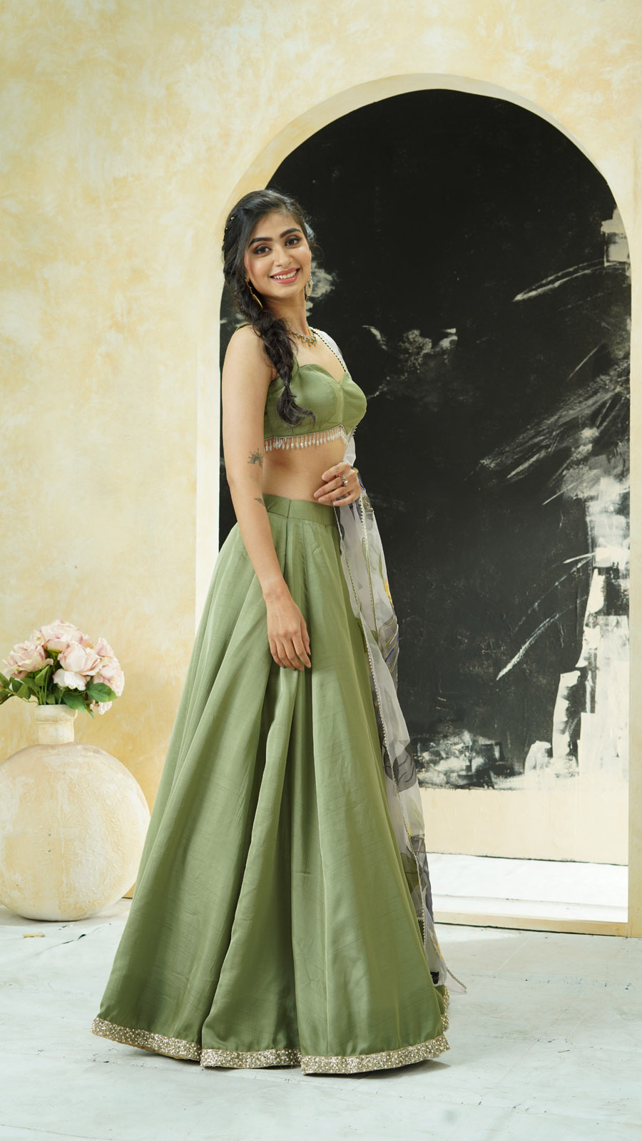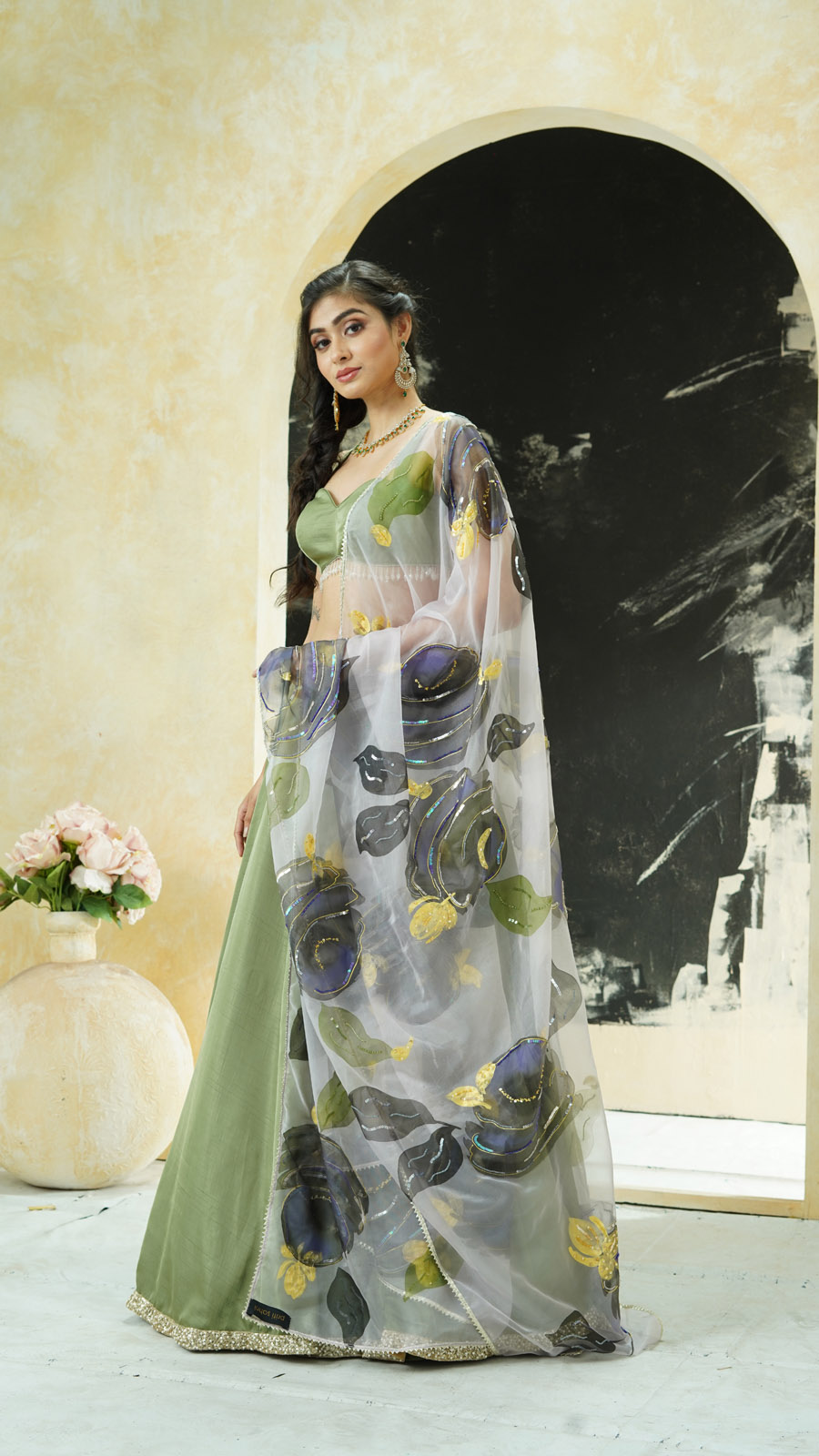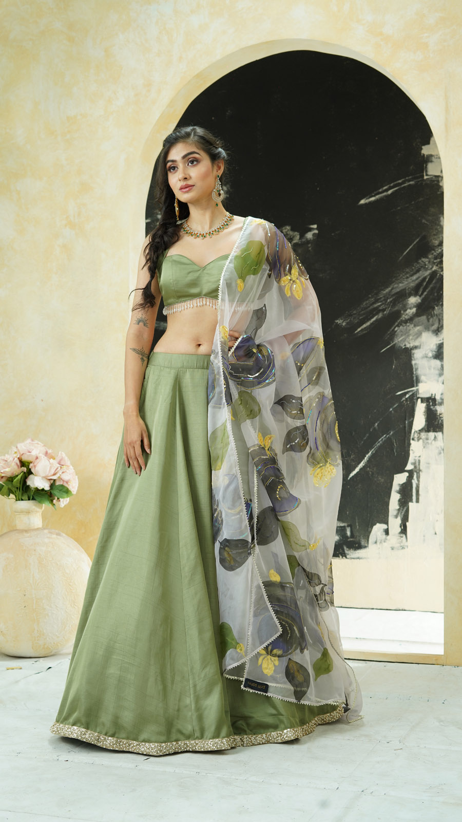Sage Green Lehenga Set With Hand Painted Dupatta