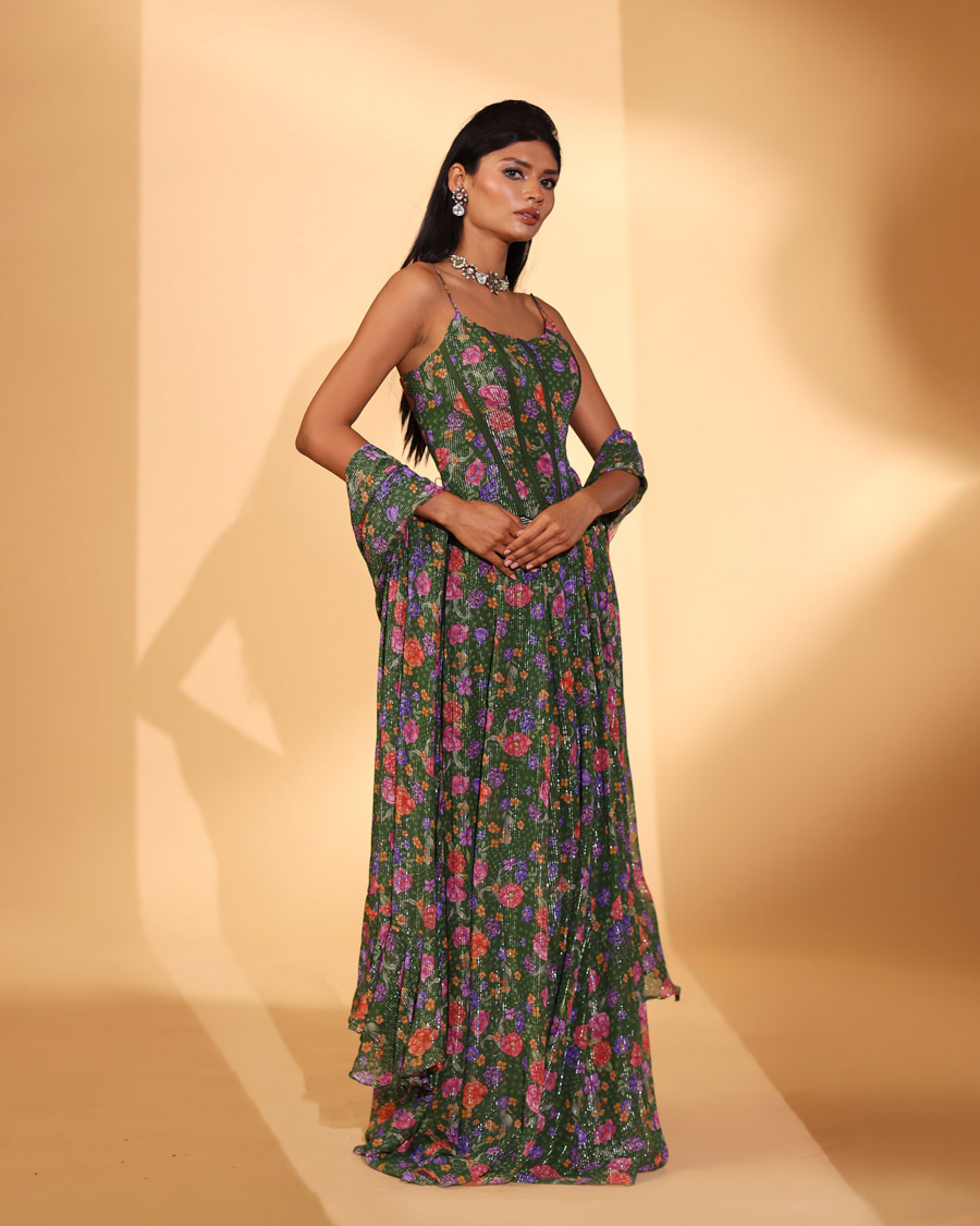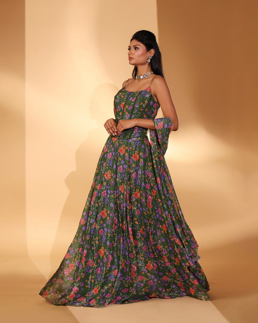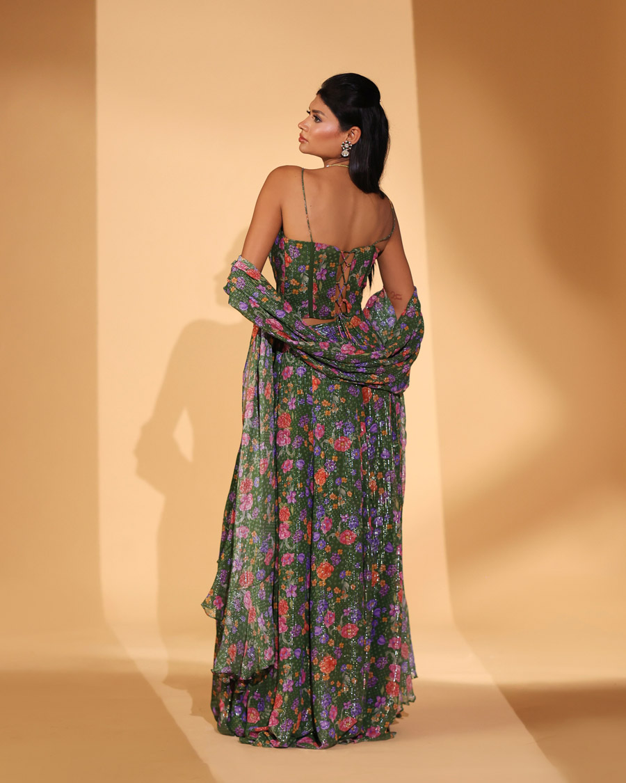 Green gardenia print lehenga.