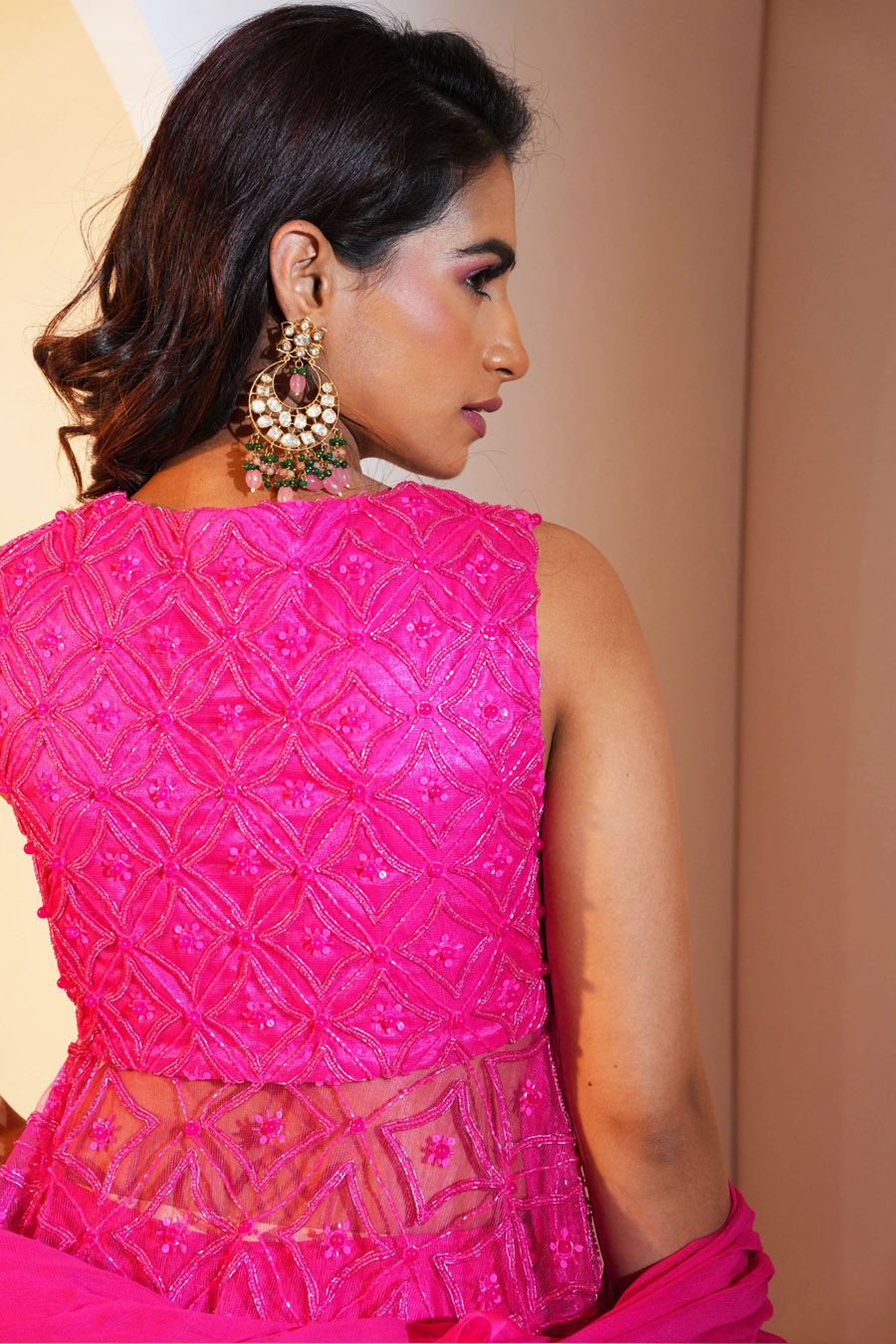 Hot Pink Hand embroidered net kurta with kalidaar Georgette sharara pants and georgette ruffled dupatta